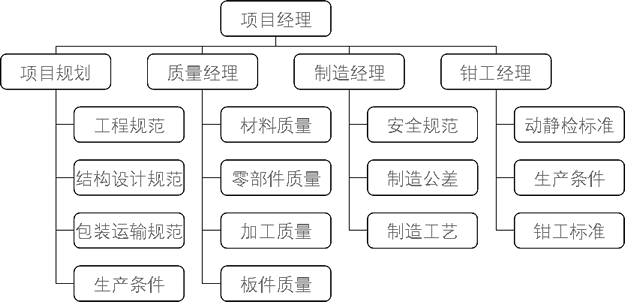 项目小组中专职的钳工经理依据项目规划的质量要求,提升产品质量;